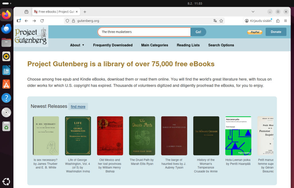 Seuraavaksi vaaditaan tunnistautuminen. Syötä salasana ja sulje App Center asennuksen valmistuttua. Avaa Firefox, ja mene osoitteeseen gutenberg.org