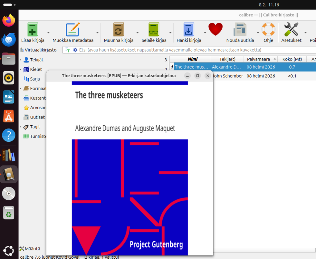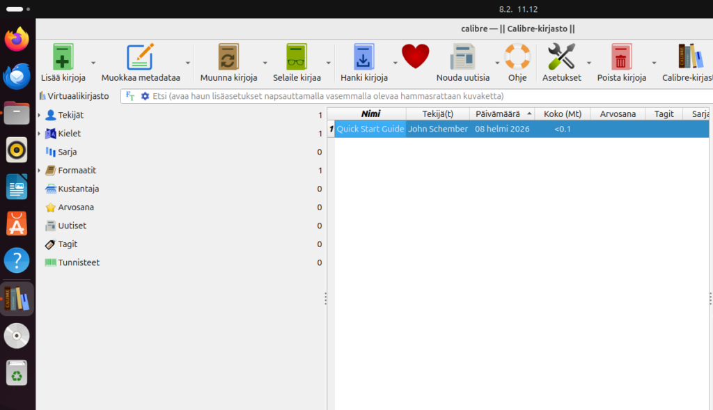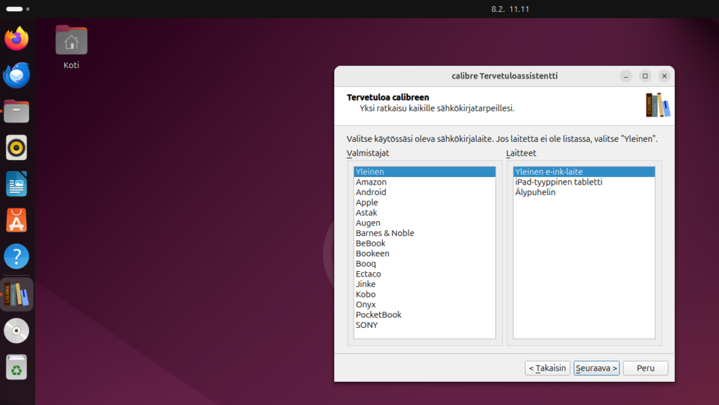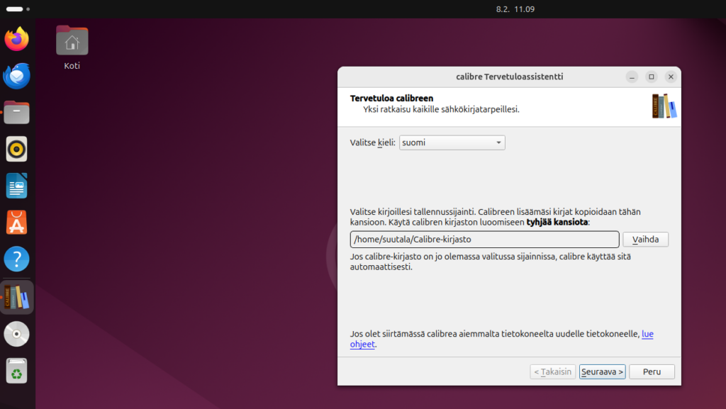 Sulje selain. Käynnistä Calibre. Ensimmäisellä käynnistyskerralla valitset kielen.